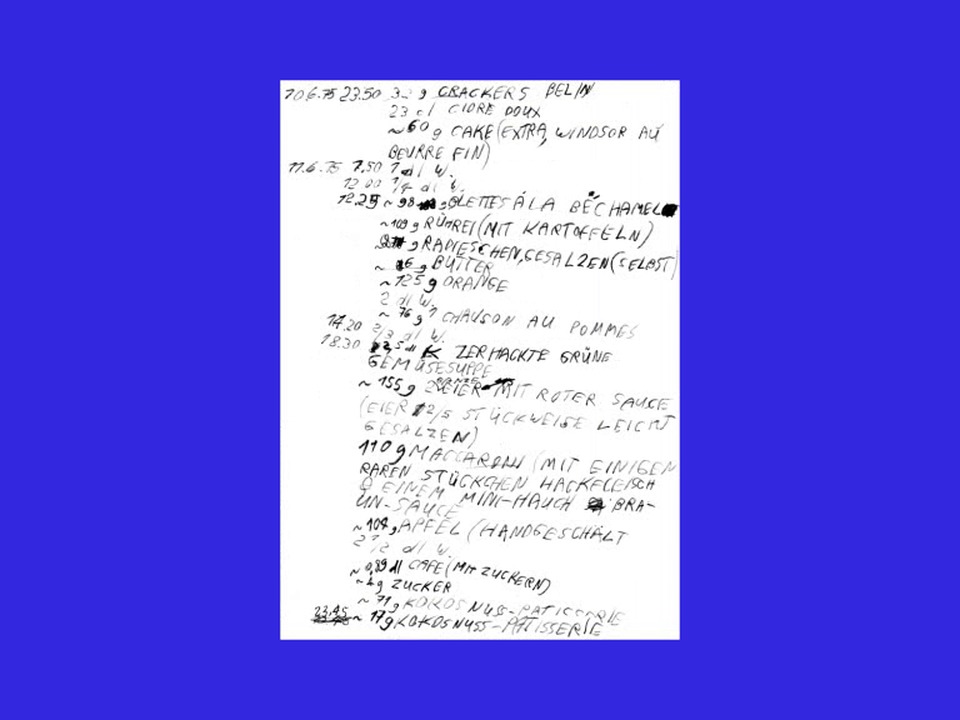 - Genres:Langzeitperformance;Genres:Lecture Performance;Bezüge:Alltag;Bezüge:Food Art;Themen:Kontrolle;Qualitäten:grotesk;Qualitäten:konzeptuell;Qualitäten:obsessiv;Mittel:Körper als Material