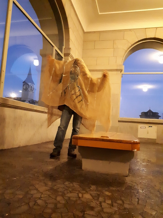 Diese Recherche ist das Herzstück von "flags". Sie hat schon viel früher begonnen - ich habe als Jugendlicher bereits versucht den Riss in mir und in Europa zu flicken.. Unter anderem z.B. mit der Performance "Bear Walk" 1998 in Zürich, Lausanne und Wien ( Regie/Kamera: Stefan Weber) wo ich als Gil Bear Sand in das Büro von Jean Pierre Hoby stürmte, in Lausanne mit einem Totenkopf tanzte und in Wien durch die Strassen und den Jüdischen Friedhof trottete und im Naturhistorischen Museum mit einem ausgestopften Bären brüllte.