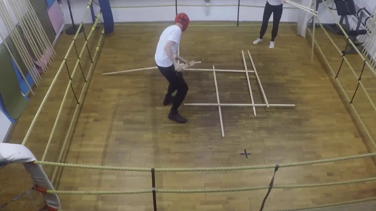 Die Performance findet in einem Boxring statt und wir tragen einen Kopfschutz.