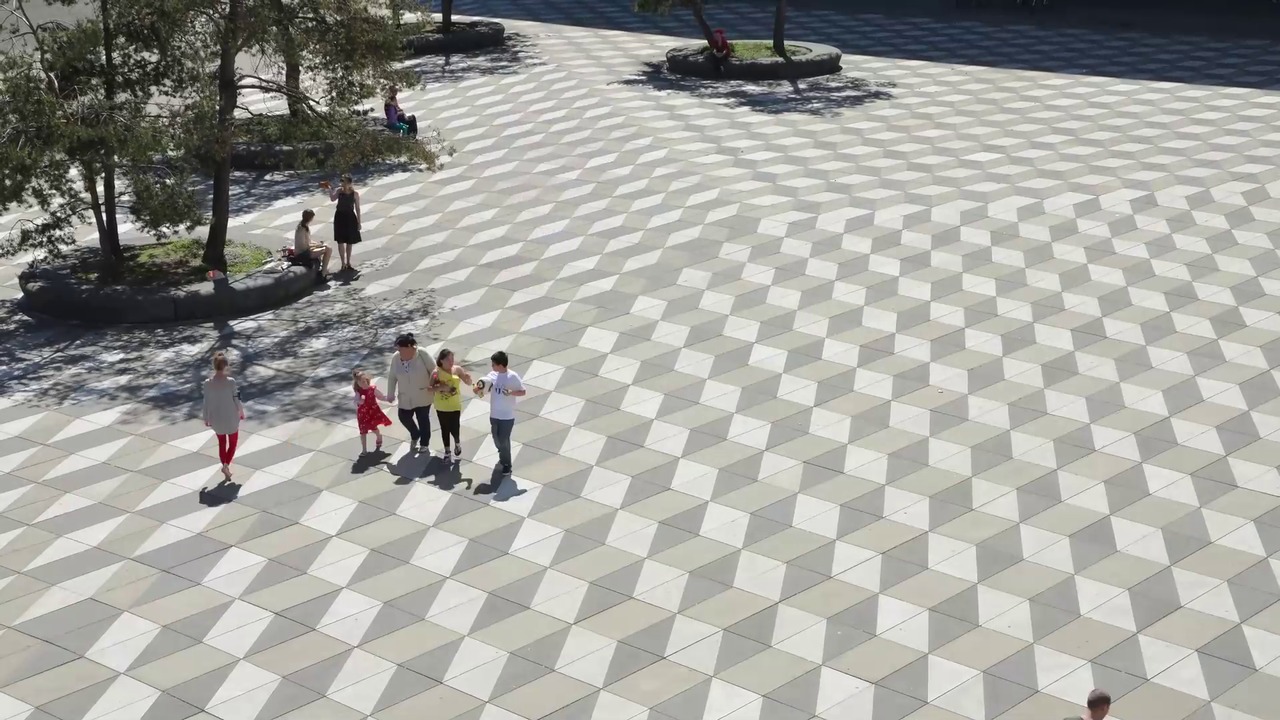 Der Platz hat eine dreieckige Form – bestehend aus verschieden grauen Bodenplatten formt sich ein abstraktes Schachbrettmuster. Wie ein Teppich, gesäumt mit einer Metallkante und leicht erhöht, legt er sich auf den städtischen Grund. Ein Teppich, der dazu einlädt, ihn zu betreten und aus seinen Strukturen heraus eigene Rhythmen von Bewegungen und Richtungen zu entwickeln. Diesen Anleitungen folgend, entwickelte ich eine Partitur für den Platz. Ich tanzte mich im Rhythmus des Bodens schneckenförmig 2,5 Std zum Mittelpunkt des Platzes. Die Grösse und die Spannung des Platzes, sein eigener Atem, wird durch meine Bewegungen spürbar.
