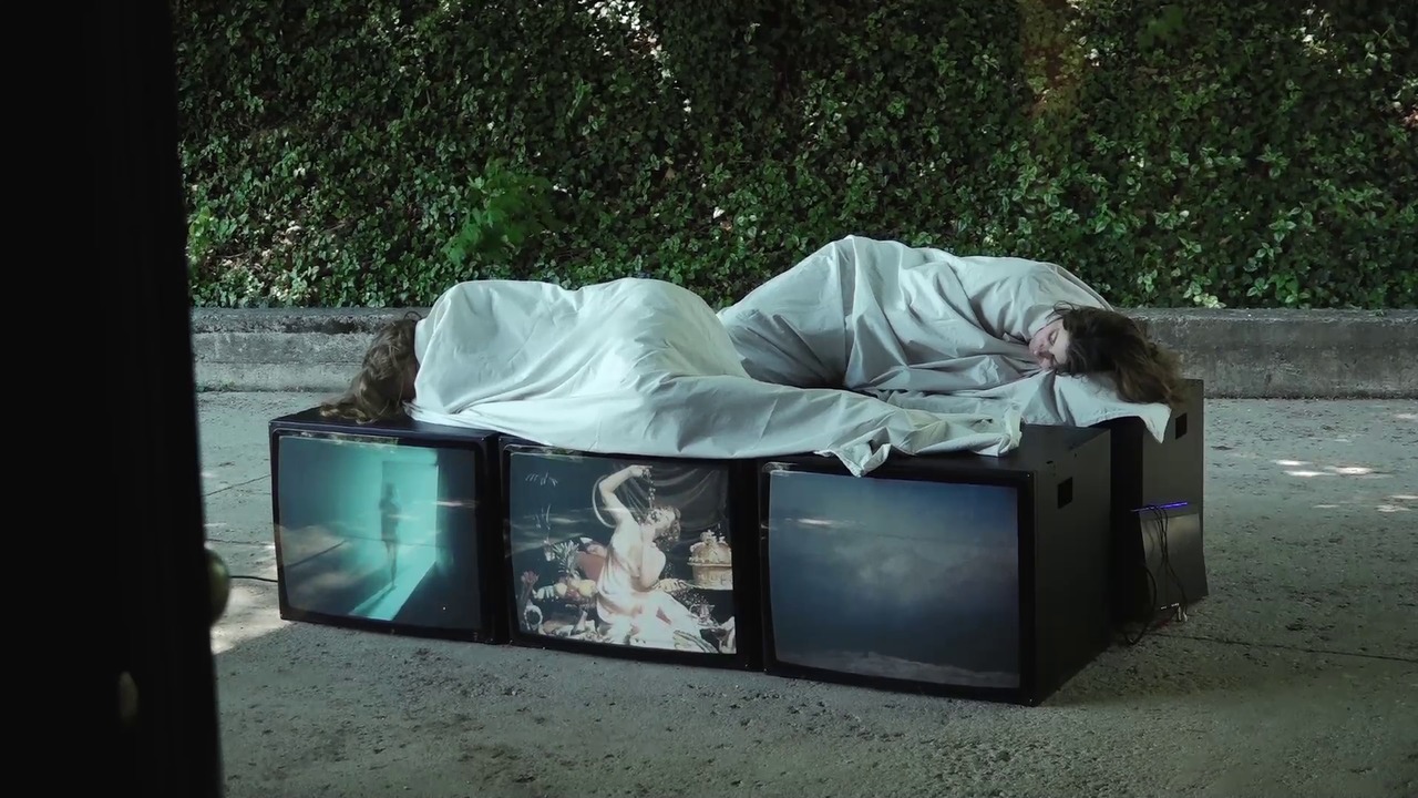 Monitoren schlafen und Einblick geben, in das fragmentartige Innere und Bildwelten entstehen lassen. In Form einer Performance zeigen wir unser Ritual des zu Bett Gehens. Danach schlafen wir auf den Monitoren, die Besucher können um uns herumlaufen und beobachten und in die Traumwelten eintauchen.