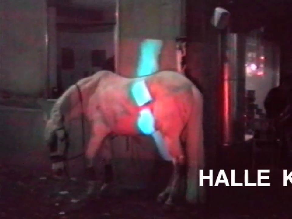 Mit einer lebenden Skulptur eröffnen die Multi-Media-Akteure "HALLE K" die Ausstellung von Stefan Wartenweiler, "Galerie Macelleria d'Arte" St. Gallen. Durch Verkehr und eilige Passanten reitet eine Frau. Bekleidet ist sie mit Hut und Anzug, die von Wartenweiler bemalt wurden. Ihr Pferd, "Pepper", ein ungesattelter Schimmel, bindet sie vor der Metzgerei der Kunst an. In zerfliessendes , farbiges Licht eines Videoprojektors getaucht, scharrt der Schimmel unruhig am Boden. Wartenweilersche Malpraktiken werden ab Videoband auf das weisse Fell projiziert. Man hört Soundcollagen, zusammengesetzt aus verfremdeten Klarinetten, Orgeln und Dialogfragmenten aus Filmen (z.B. "Es ist nicht leicht ein Gott zu sein" von Peter Fleischmann. Verwendung des Tons bewilligt). Ein Musiker spielt Saxophon, ein Anderer verteilt wortlos ein Kassettengerät an einen Zuschauer, mit Endlos zwitschernden Waldvogeltönen. Einer erhebt seine Stimme zum Publikum: "Darum und damit ihr noch besser nichts versteht, schenke ich Euch die Worte - Wunschgefühl - Waldrausch - Wohlkampf - Wahrheitsgefühl - Wegetot - Warumkopf - Weshalbliebe - Weisheitsgefühl - und - Wartenwählerisch". Darauf schwingt sich die Frau aufs Pferd und reitet davon.