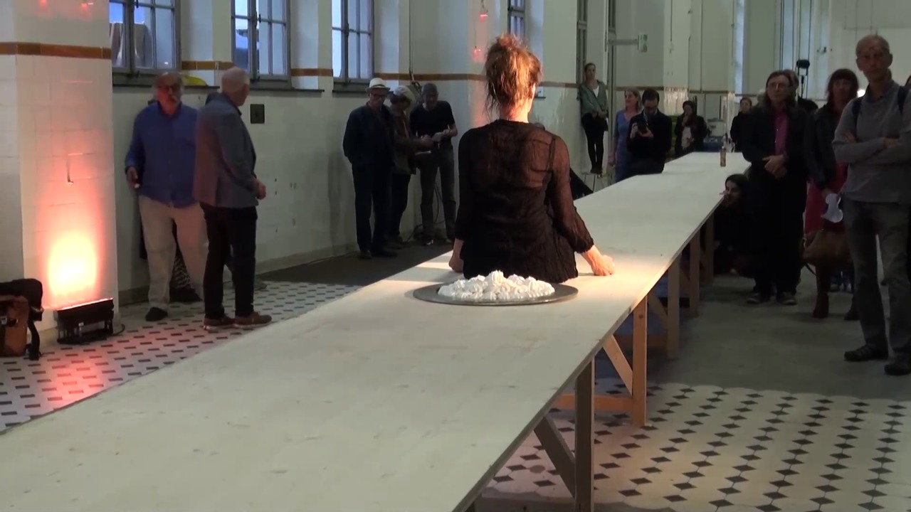 - Themen:Körpererfahrung;Qualitäten:langsam;Qualitäten:schwarz-weiss;Handlungen:gehen;Handlungen:liegen;Materialien:Esswaren;Mittel:Körper und Objekt;Räume:Ausstellungsraum