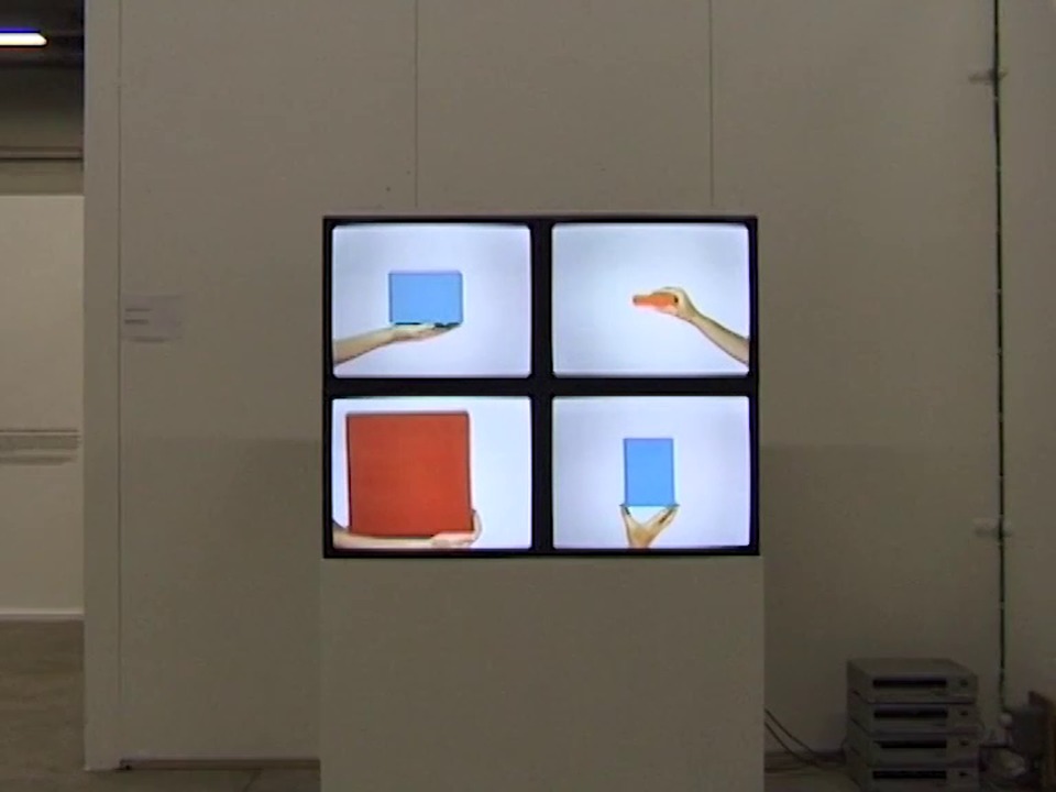 Auf vier Monitoren werden verschiedene geometrische Formen ins Bild hineingeschoben und nach einer Pause wieder hinausbewegt. In einer Choreographie der Kuben und Quader, mit wechselndem Rhythmus, langsamen und schnelleren Sequenzen, entstehen unterschiedliche Bildkompositionen, die stehenbleiben, verändert und wieder verworfen werden.