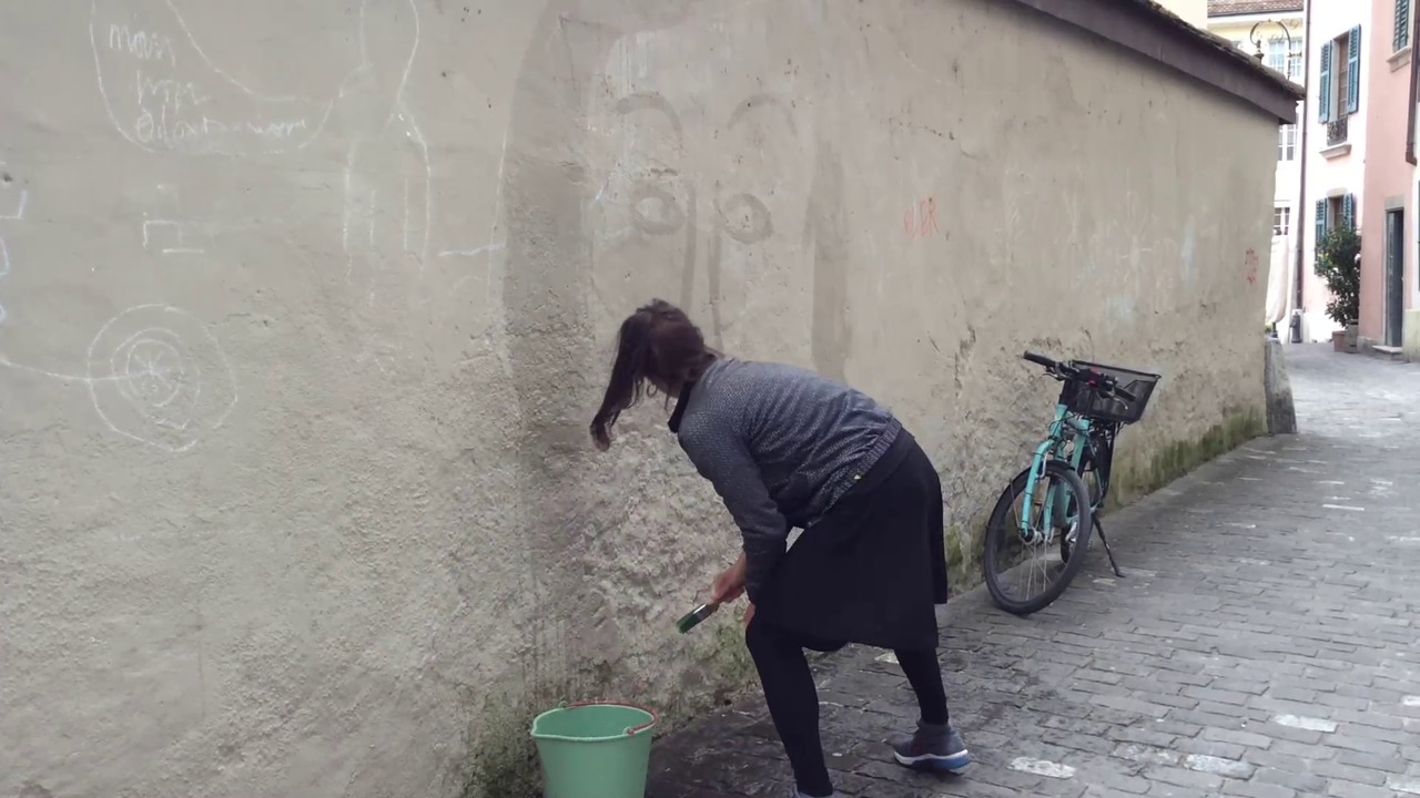 Mit Wasser und Pinsel zeichnet Caroline Singeisen Porträts auf Stein- und Betonmauern im urbanen Raum. Die Entstehung der Wasserzeichnungen ist jedes Mal ein Ringen um die Zeit, ein Spiel mit Beständigkeit und Verlust. Als Ort für zeichnerische Interventionen interessieren sie der stark frequentierte Bahnhofsplatz ebenso, wie die winterliche Schwimmbadanlage. In jeder Situation reizt es sie, die Beziehungen zwischen ihr als Akteurin, der ephemeren Präsenz der Figuren und dem Umfeld auszuloten. Für „Les jours des éphémères“ wird die Künstlerin den Stadtraum vor dem Künstlerhaus bespielen und ausserdem das Video „Begegnung mit dem Verschwinden“ im Haus zeigen.