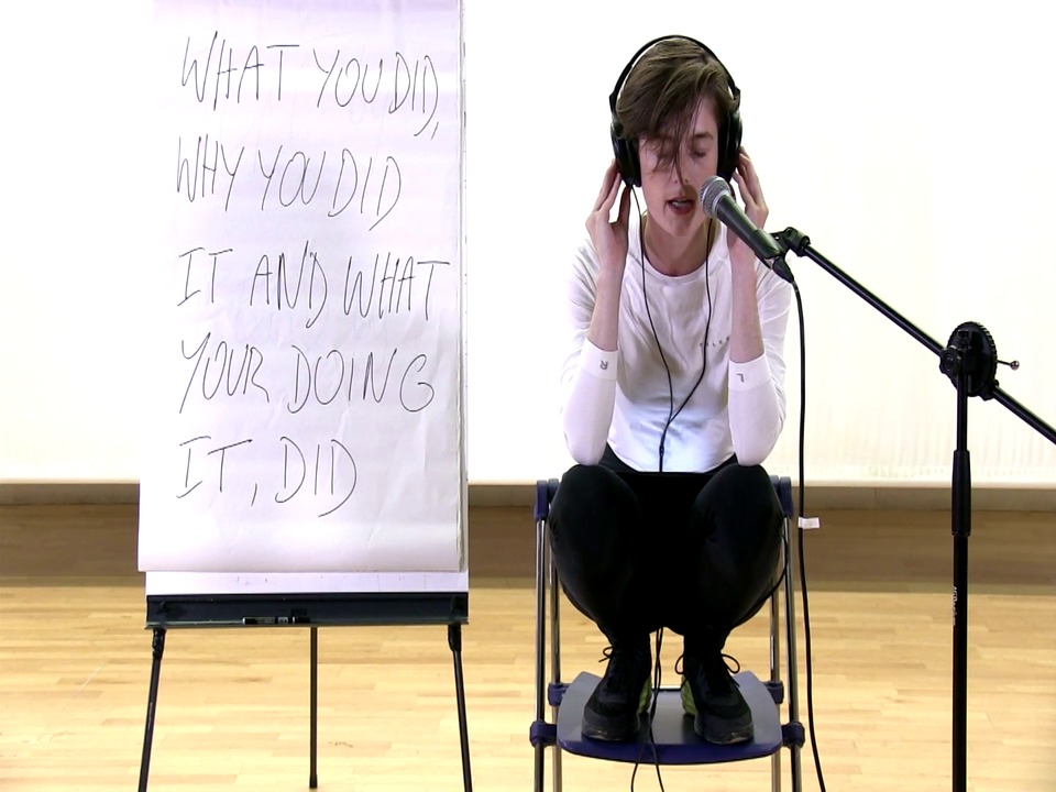 - Genres:Handlungsvollzug;Themen:Übersetzung;Mittel:Sprache;Mittel:Stimme;Räume:Ausstellungsraum;Materialtyp:Performance/Aktion für die Kamera