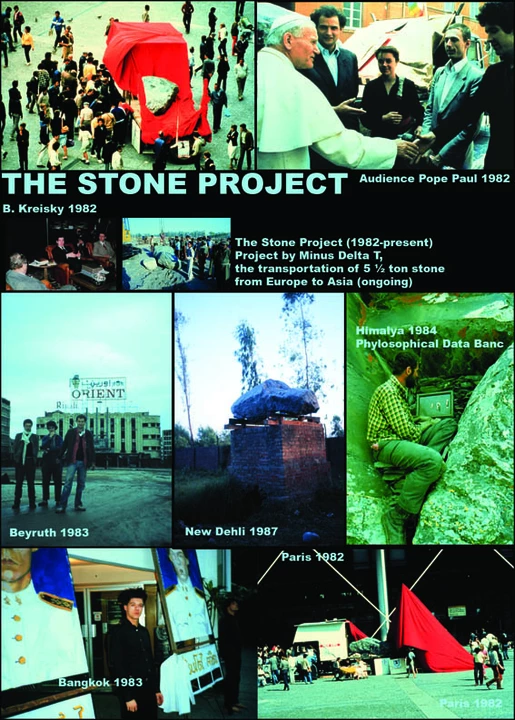 Die Musikperformancegruppe Minus Delta t hat von 1981 bis heute einen 5 1 /2 Tonnen Stein blauer Granit aus Prescelly Mountains Wales (Ursprungsort des inneren Steincircles von Stonehenge ) von Europa nach Asien transportiert und ein permanentes Gesamtkunstwerk inszeniert. Nach 5 Jahren im Ganges bei Rishikesh und 10jahren bei einem Tempel in New Delhi liegt er seit mehreren Jahren in der österreichischen Botschaft in New Delhi und wartet auf die Weiterreise nach China. There is a lot do ... and still ongoing practice cultural exchange ... Viel viel mehr zu erzählen und zu vermitteln