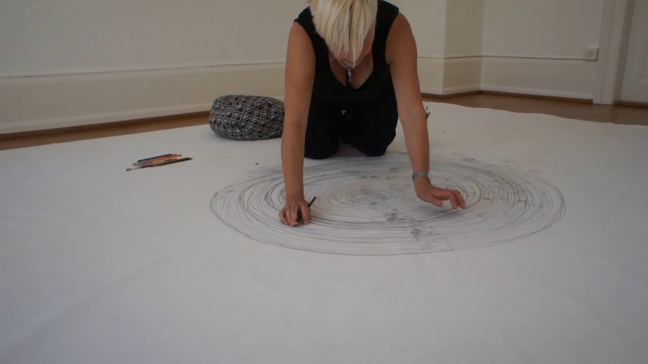 Würdigung der 800 jährigen Linde. Mit dem Bleistift von einem Punkt in der Mitte des Papiersblattes 800 immer grösser werdende Kreise ziehen. Dieser 7 stündige Wachstumsnachvollzug begleitet vom Geräusch der Lindenblätter im Winde ist eine transeartige Hingabe. Während der Ausführung sind die Blattgeräusche von leichtem bis zu starkem Wind zu hören. Der Druck auf dem Bleistift hängt von den verschiedenen lautstärken des Windes ab. Es ergeben sich auf diese Weise vielfältige Strichvaleure der Jahresringe, was die jährlich unterschiedlichsten klimatischen Lebensbedingeungen dieses Baumes aufzeigen. Die Ausführung wird bis 7 Stunden dauern.