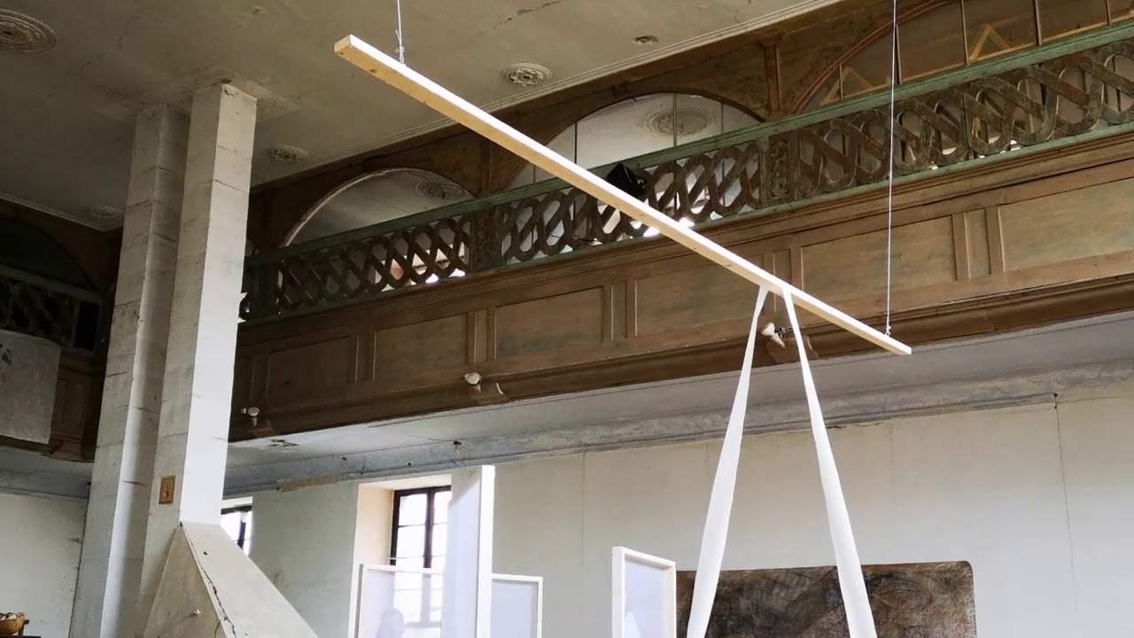 Schmale Papierstreifen werden über eine in 3m Höhe unterhalb des grossen Fenster aufgehängte Holzlatte geworfen.