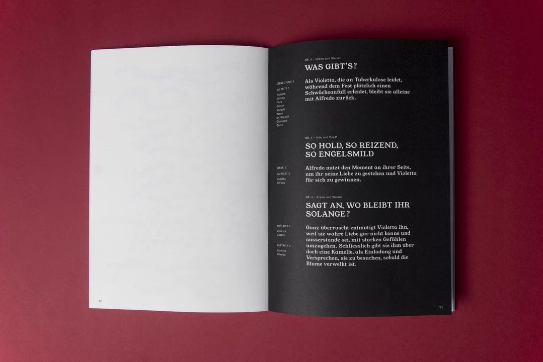 Am Beispiel des ersten Aktes der Oper La Traviata habe ich in meiner gestalterischen Arbeit Lösungsansätze für diese Fragen erarbeitet. Die gegebene Struktur der Musiknummern wird dabei genutzt, um dem Leser eine Übersicht der Szenen und relevanten Informationen zu geben. Mittels der Neuverteilung des Einführungstextes wird für den Leser ein zeitnahes Leseerlebnis geschaffen. Gestützt auf den Handlungsverlauf, der Funktionen der einzelnen Stücke und dem semantischen Gehalt der Texte, gewinnt die Gestaltung des Librettos an Mehrwert. Anhand der typografischen Inszenierungen und Eingriffen werden die in den einzelnen Stücken relevanten Themen hervorgehoben, die Charakterzüge der Protagonisten unterstrichen und die Koloratur der Emotionen differenziert.