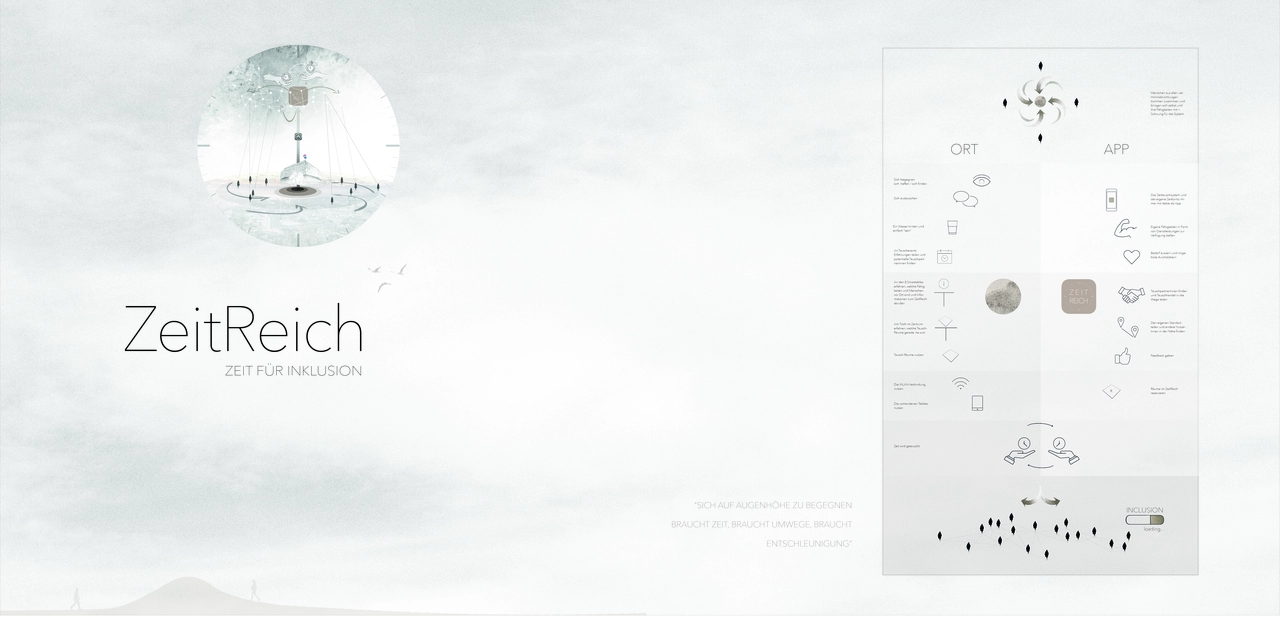 Als ungezwungener Ort der Begegnung untergräbt das ZeitReich die klare architektonische Struktur des Swisscomgebäudes und bietet eine fliessende Oase der Zeit als Kontrast zur effizienzorientierten Umgebung. Die Innenarchitektur orientiert sich am Erlebnis der Begegnung und der Entschleunigung. Geschwungene Wege, transluzente Wände und Lichter, die ein Treffen signalisieren, spielen mit der Idee, dass Inklusion Zeit braucht und sich Menschen oft nicht auf direktem Weg, sondern auf Umwegen finden. Ausgehend vom ZeitReich soll sich der Gedanke der Inklusion über die Menschen und die sie vernetzende App, in die ganze Stadt und weit darüber hinaus ausbreiten.