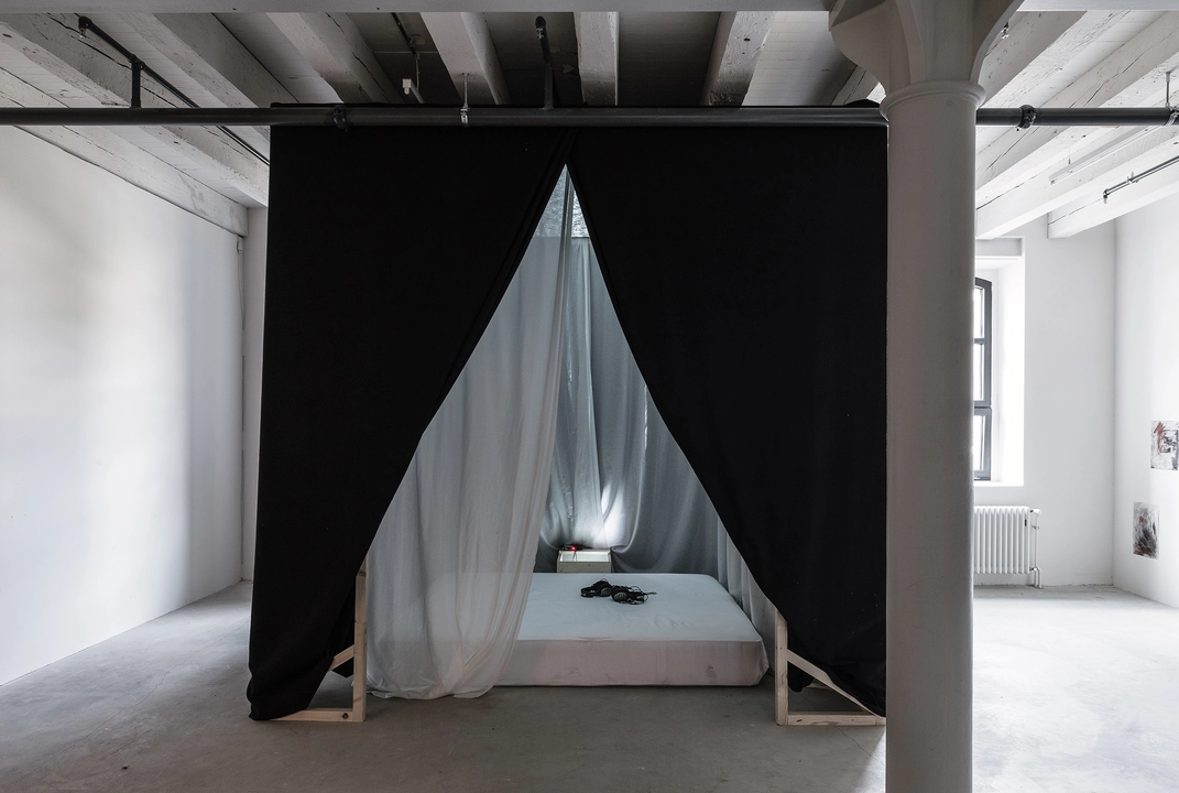 Die Video/Ton-Installation lädt ein, sich hinzulegen und sich die Kopfhörer aufzusetzen. Gleichzeitig soll mit der Betrachtung von unten die Decke nach oben aufreissen und den Weg auf die Illusionswelt des Traumes freigeben.