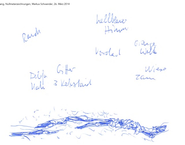 "Markus Schwander erprobte auf seinen Spaziergängen der Testphase einen Aufzeichnungsmodus, der schriftliche und zeichnerische Notation miteinander verknüpft. Ausgehend von dem auf eine Intervention Paul-Armand Gettes zurückgehenden ‹ 0m › bei Lucius Burckhardt skizziert Schwander auf den Spaziergängen das direkt vor ihm Liegende und hält alles in der Ferne Liegende in kurzen schriftlichen Sentenzen oder Wortfolgen auf derselben Karte fest." Beate Florenz