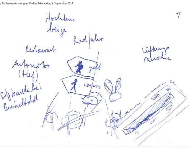 "Markus Schwander erprobte auf seinen Spaziergängen der Testphase einen Aufzeichnungsmodus, der schriftliche und zeichnerische Notation miteinander verknüpft. Ausgehend von dem auf eine Intervention Paul-Armand Gettes zurückgehenden ‹ 0m › bei Lucius Burckhardt skizziert Schwander auf den Spaziergängen das direkt vor ihm Liegende und hält alles in der Ferne Liegende in kurzen schriftlichen Sentenzen oder Wortfolgen auf derselben Karte fest." Beate Florenz
