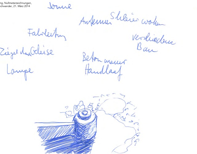 "Markus Schwander erprobte auf seinen Spaziergängen der Testphase einen Aufzeichnungsmodus, der schriftliche und zeichnerische Notation miteinander verknüpft. Ausgehend von dem auf eine Intervention Paul-Armand Gettes zurückgehenden ‹ 0m › bei Lucius Burckhardt skizziert Schwander auf den Spaziergängen das direkt vor ihm Liegende und hält alles in der Ferne Liegende in kurzen schriftlichen Sentenzen oder Wortfolgen auf derselben Karte fest." Beate Florenz