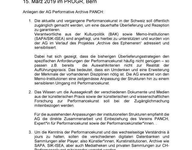 Denkpool V war als geschlossene Veranstaltung konzipiert, in der Anliegen und Desiderate diskutiert wurden. Dabei ging es zunächst um das weitere Vorgehen im Dialog mit SAPA und die Frage, wie mögliche Formen einer Kooperation zwischen der AG / PANCH und SAPA aussehen könnten. Im Laufe des Projekts Archive des Ephemeren war immer greifbarer geworden, dass ein organisatorischer Gap zwischen der AG als Repräsentantin des Vereins PANCH und den Memo-Institutionen besteht, den es zu überwinden gilt. Die AG wünscht sich, als gleichberechtigtes Gegenüber von Memo-Institutionen z.B. von SAPA akzeptiert zu werden. Nur so kann sie ein Bewusstsein für Archivierungsformen von Performancekunst vermitteln, welche die Perspektive der Künstler*innen berücksichtigt oder gar ins Zentrum stellt. Als aussenstehender Experte für ein damals bevorstehendes Gespräch mit SAPA hat sich Peter Erismann mit einem reichen Erfahrungshintergrund in kulturpolitischen Fragestellungen bereit erklärt die AG dabei zu unterstützen. Anschliessend wurde das Vorgehen der AG im Hinblick auf die neue Kulturbotschaft diskutiert, die 2021 in Kraft tritt. Dabei schien es wichtig, die Anerkennung und Förderung von Performancekunst auf kulturpolitischer Ebene ( Bund: kulturpolitische Botschaft / Fördereinrichtungen / Archive / Verbände) zu stärken. Hier ist Vermittlungsarbeit zu leisten, denn die Archivierung von Performancekunst fällt in der Schweiz in unterschiedliche Zuständigkeitsbereiche, was ihre Erhaltung und Vermittlung auf politischer und institutioneller Ebene erschwert. In mehreren Treffen zwischen der AG, dem PANCH-Vorstand und wichtigen Protagonist*innen der Performancekunst, wurde eine Stellungnahme auf die jüngst erschienene Vernehmlassung zur Kulturbotschaft lanciert.