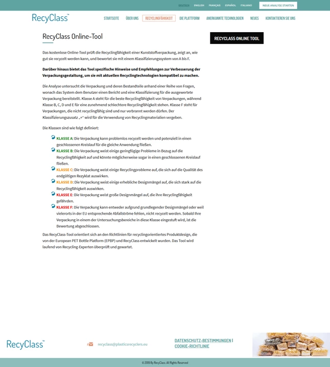 "RecyClass ist eine Initiative, die der Kunststoff-Wertschöpfungskette intelligente Verfahren und Bewertungskriterien für recyclingorientiertes Produktdesign von Verpackungsprodukten bereitstellt, mit dem Ziel, deren Recyclingfähigkeit zu verbessern.