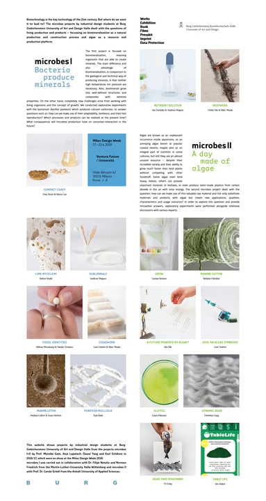 "Biotechnology is the key technology of the 21st century. But where do we want it to lead to? The microbes projects by industrial design students at Burg Giebichenstein University of Art and Design Halle dealt with the questions of living production and products – focussing on biomineralisation as a natural production and construction process and algae as a resource and production platform."