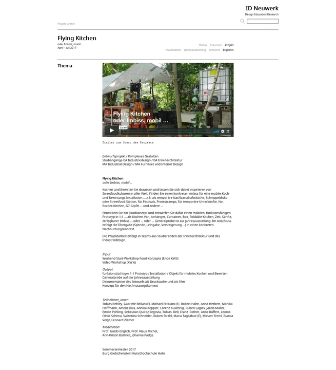 Entwickeln Sie ein Foodkonzept und entwerfen Sie dafür einen mobilen, funktionsfähigen Prototyp in 1:1 … als Kitchen-Van, Anhänger, Container, Box, Foldable Kitchen, Zelt, Sänfte, zerlegbarer Imbiss … oder … oder … Generalprobe ist zur Jahresausstellung. Im Anschluss erfolgt die Übergabe (Spende, Leihgabe, Versteigerung …) in einen konkreten Nachnutzungskontext.“
