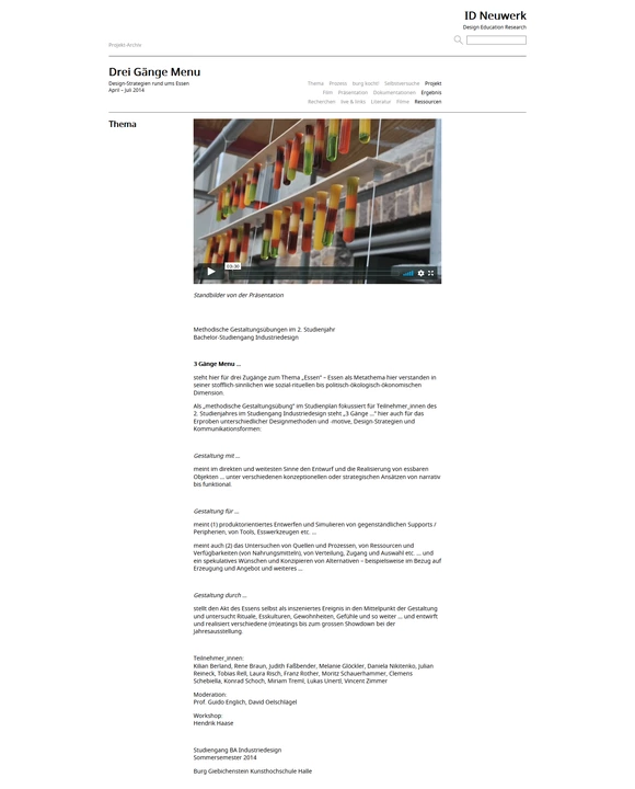Als „methodische Gestaltungsübung” im Studienplan fokussiert für Teilnehmer_innen des 2. Studienjahres im Studiengang Industriedesign steht „3 Gänge …” hier auch für das Erproben unterschiedlicher Designmethoden und -motive, Design-Strategien und Kommunikationsformen.“