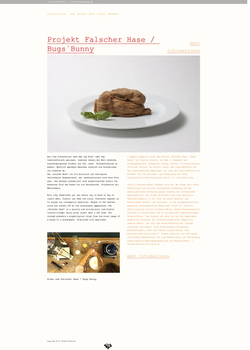 Der „falsche Hase“ ist ein moralisch und ökologisch vertretbarer Gegenentwurf, der Insektenfleisch eine neue Form gibt. Das Konzept präsentiert eine morphologische Studie vom bekannten Bild des Hasen hin zur Heuschrecke, 3D-gedruckt mit Mehlwürmern.“