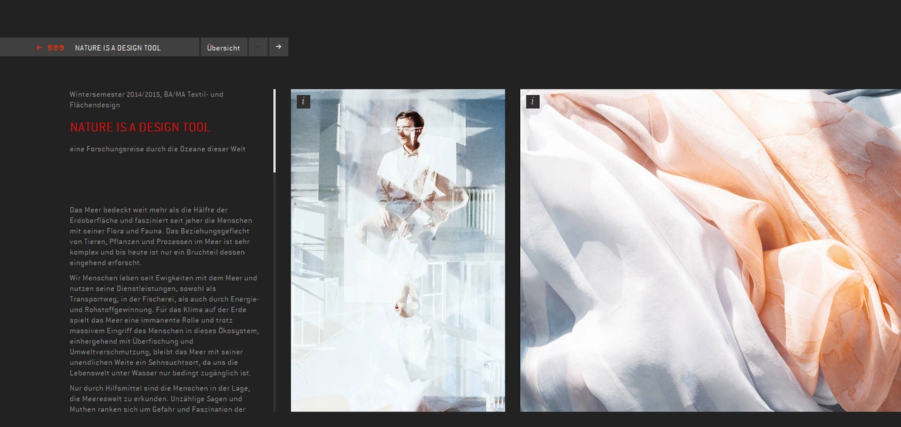 "Das Lernen von der Natur und den biologischen Prozessen ist für Gestalter ein relevanter Teil für die Entwicklung von Ideen und Problemlösungen. Die Anpassung von Lebewesen an ihre spezifischen Umweltbedingungen lässt Prinzipien erkennen, die als Funktionsmechanismen in Technik und Design übertragen werden können. Durch die Betrachtung und Untersuchung einzelner Bestandteile und Phänomene der Meere sollten die Studierenden Inspirationsquellen finden, die Gestaltungsansätze boten.