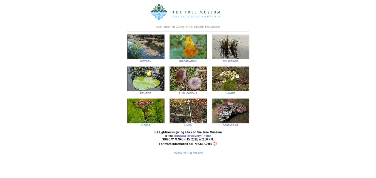 The Tree Museum was established in 1997 and is a site set on the pre Cambrian shield amidst the cottage county-side of Muskoka. It is located on Ryde Lake near the town of Gravenhurst, Ontario. The site is undeveloped and includes both waterfront and forest. For the participating artists, this opportunity represents a rare occasion to realize major outdoor artworks in an uncultivated environment.