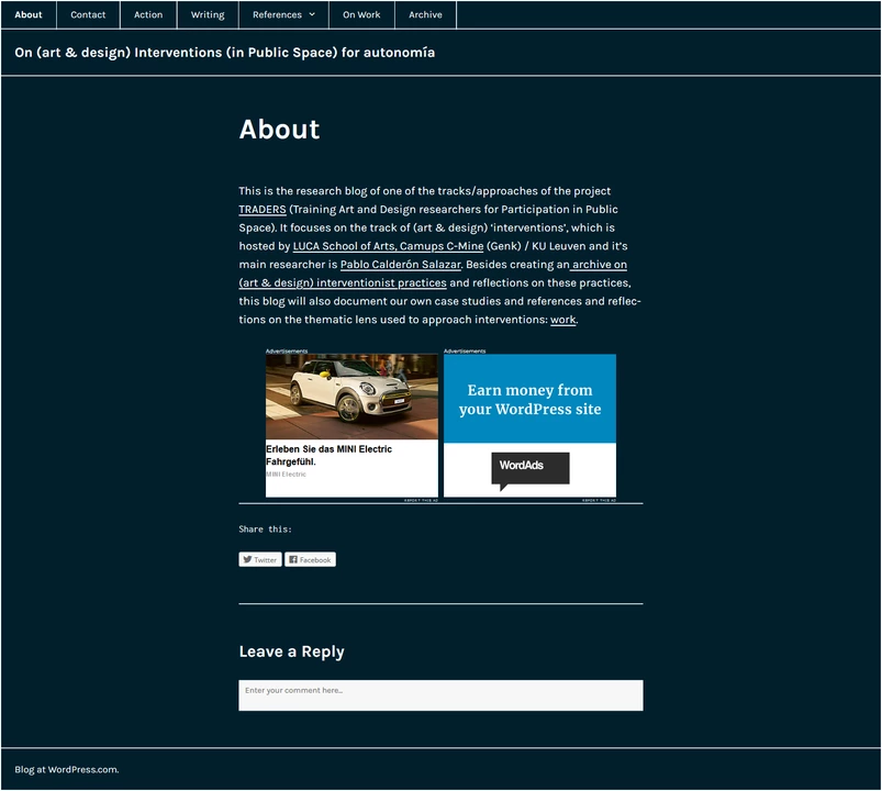 "This is the research blog of one of the tracks/approaches of the project TRADERS (Training Art and Design researchers for Participation in Public Space). It focuses on the track of (art & design) ‘interventions’, which is hosted by LUCA School of Arts, Camups C-Mine (Genk) / KU Leuven and it’s main researcher is Pablo Calderón Salazar. Besides creating an archive on (art & design) interventionist practices and reflections on these practices, this blog will also document our own case studies and references and reflections on the thematic lens used to approach interventions: work."