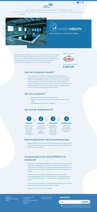 "Die Fachkategorie WasserKREATIV des Neptun Wasserpreis widmet sich der künstlerischen Auseinandersetzung mit dem Element Wasser. Es können innovative Entwürfe und Projekte eingereicht werden, die sich kreativ mit dem Thema Wasser auseinandersetzen und aus den verschiedensten Kunst- und Kulturrichtungen stammen. Vorrangig angesprochen werden Kunst- und Kulturschaffende aus Bereichen wie Multimedia, Film, Musik, Literatur, Architektur, bildende und darstellende Kunst. Auch Foto- und Performancekunst kann eingereicht werden."