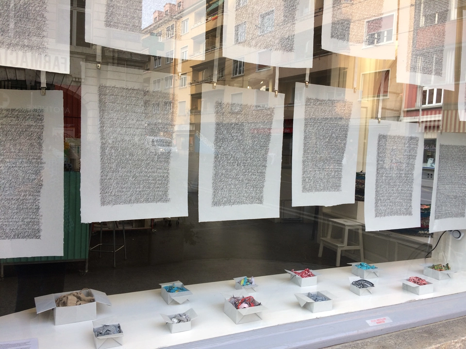 Die Papierbögen bilden die Grundlage für das Weitertreiben der Erinnerungsarbeit. Jedem ausgewählten Kleidungsstück ist ein Bogen gewidmet. Eingetaucht in die Erinnerung gelangt die Künstlerin in einen Schreibfluss und überschreibt das Papier mehrfach – so werden diese «Endlosbriefe» sprichwörtlich zu einem Gewebe. Damit kommen das Textil und der Text – die beide auf denselben etymologischen Ursprung von textus für Gewebe zurückgehen – aufeinander zu liegen und durchdringen sich.
