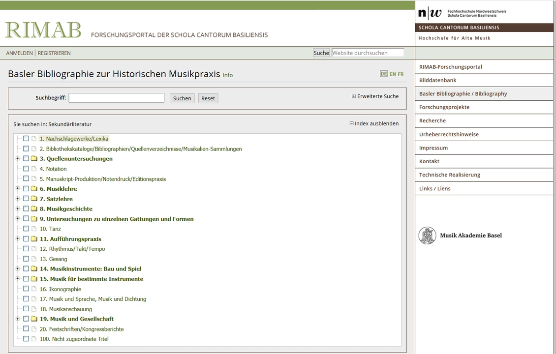 | The bibliographical database of the Schola Cantorum Basiliensis was compiled by Martina Wohlthat from 1974 to 2017 and contains about 30,000 entries. It entails publications connected to the subject of historical musical practice (historical performance practice, history and theory of early music). In terms of content, they range from the beginnings of western music to the period around 1850. The Basel Bibliography differs from all other music-oriented bibliography databases (e.g., RILM, BMS) above all due to its classification scheme. With it, the recorded titles are assigned to precisely defined subject areas. In this way, subject areas can be circumscribed with unparalleled precision. |