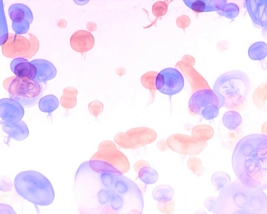 Jellyfish are gelatinous organisms that need water currents in order to survive. Nives Widauer combines scientific knowledge with a seductive esthetic and different levels of meaning. She dyed the film material into blue, red and green sequences that are played in loops. The irresistible current not only draws the pulsating, weightlessly drifting invertebrates, but also the eye of the spectator. In Greek mythology, the sight of Medusa (another word for jellyfish) turned men into stone.