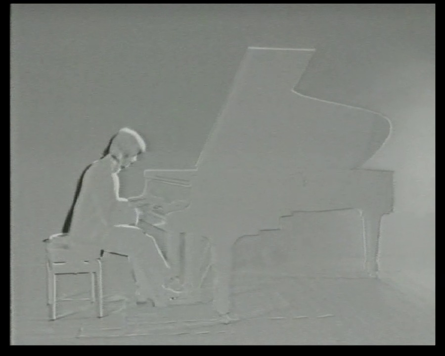 In her video Franziska Megert shows the pianist Eckhard Sobiech, playing Bach and Rachmaninoff (J.S Bach: Prelude in a Minor from the Well-Temepered Clavier, S. Rachmaninoff: Prelude op.32, Nr 12, g sharp Minor). Both composers had contrary aspirations for their work, Bach composed his Prelude for beginners while the pieces by Rachmaninoff were meant only for professional pianists. This juxtaposition is mirrored in the video by Franziska Megert: Each piece was filmed twice, once in regular black-and-white, a second time in inverted values. "Piano Solo for Video" is composed of both those footages overlapping. The result is a gray image, subtle differences show the silhuette of the musician and his piano. At the moments of highest contrast single black or white shapes emerge. Thus the rhythmic motions of the film seems to become analogous with the keys of a piano. The piano solo is transposed, as the title mentions, into a video composition. In the words of Franziska Megert: „The intraindividual difference – made visible through the pianist’s dexterity (concetration) and the movement of his body (emotion) – observed during the playing of two pieces with varying difficulty is the topic of PIANO SOLO FOR VIDEO.“