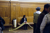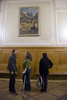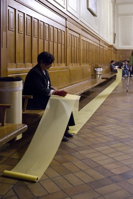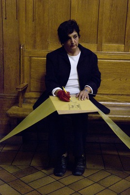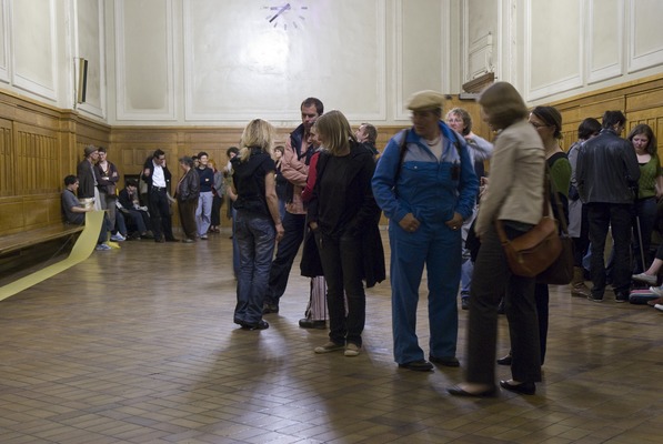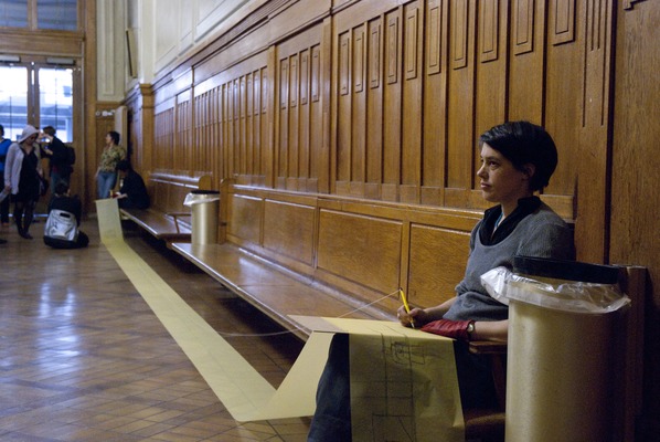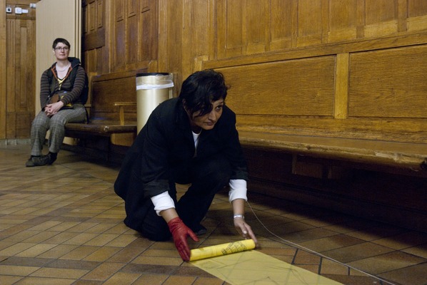 Wir sitzen an zwei auseinander liegenden Punkten des Raumes und zeichnen. Zwischen uns ist eine Papierrolle quer durch den Raum ausgelegt und die Stifte sind durch einen Faden miteinander verbunden. Auf dieses gemeinsame Papier setzen wir in einem fortlaufenden Prozess spontane Zeichnungen der unmittelbaren Umgebung. Das Publikum kann sich frei im Raum bewegen und uns bei der Arbeit zuschauen. Die Performance wird von den sich wiederholenden Klängen einer indische Musikmaschine begleitet. Die Performance LOOC wurde für Performancesaga (www.performancesaga.ch) in Basel erarbeitet und erstmals im April 09 im Wartesaal im Französischen Bahnhof aufgeführt.