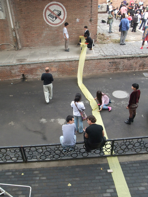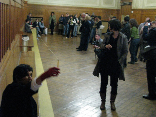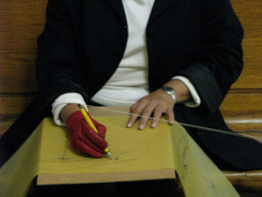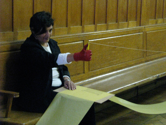 We sit at two separate points in the room and draw. A roll of paper is laid out between us across the room and the pens are connected by a thread. In a continuous process, we draw spontaneous drawings of our immediate surroundings on this shared paper. The audience can move freely around the room and watch us at work. The performance is accompanied by the repetitive sounds of an Indian music machine. The performance LOOC was developed for Performancesaga (www.performancesaga.ch) in Basel and first performed in April 09 in the Wartesaal at the Französischer Bahnhof.