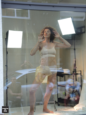 Während der Performance entsteht in einem Liveact ein Gemälde, das von der Künstlerin mit Fiilzstiften auf die Scheibe gemalt wird. Das Gemälde wird nach Fertigstellung abgewischt von der Künstlerin. Die Filzstifte werden von der Kuratorin