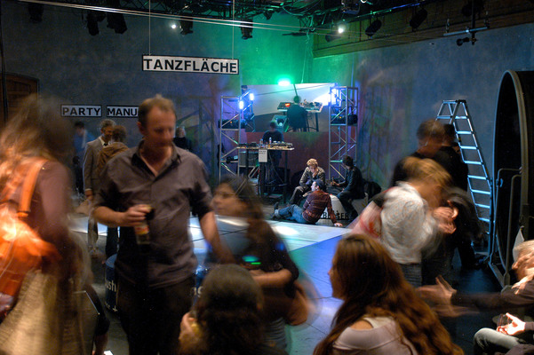 Die gesamte Ausstattung des uns zur Verfügung gestellten Raums wurde in eine Partykulisse verwandelt Die dazugehörigen grundlegenden Elemente wie Musikanlage, Discokugel, Beleuchtung und Barbetrieb gaben die übliche Atmosphäre wieder. Erst auf den zweiten Blick wurde die Kraft, die den gesamten Mechanismus in Bewegung brangt, ersichtlich: Die komplette Einrichtung der PARTY MANUAL wurde manuell, durch den permanenten Einsatz menschlicher Energie betrieben. Die Niedervolt-Stromversorgung wurde von Temporärangestellten über die von uns produzierten Gerätschaften – Laufrad, Handkurbeln, Fahr- und Liegeräder – gewährleistet. Über folgende Zeitungsanzeigen wurden hierfür an einem interessierte Stellensuchende engagiert.