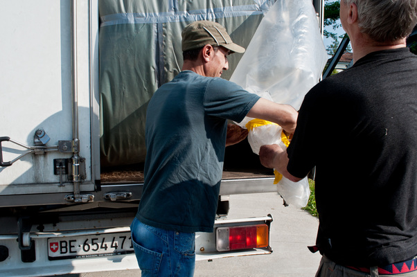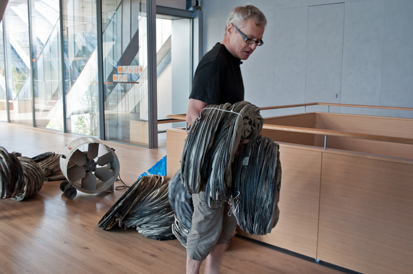 La charge aérienne est transportée devant la cabane B par le convoi de brides. En quelques gestes rapides, le tuyau est monté et le ventilateur est placé dans la Cabane B. Le ventilateur souffle alors l'air incubé avec l'art du grand maître dans l'espace vide - le "White Cube" - et anime l'ouest de Berne.