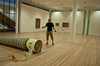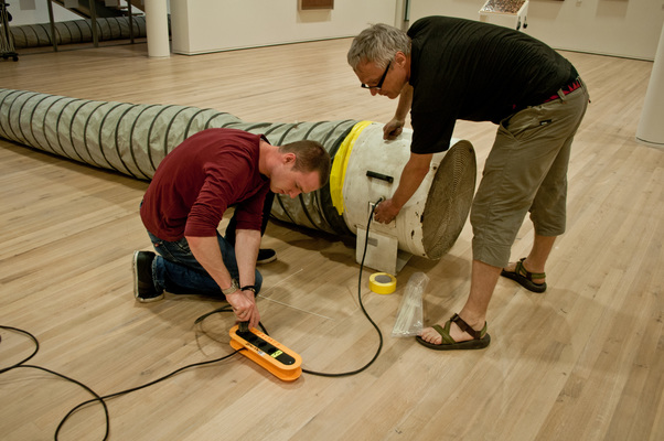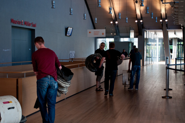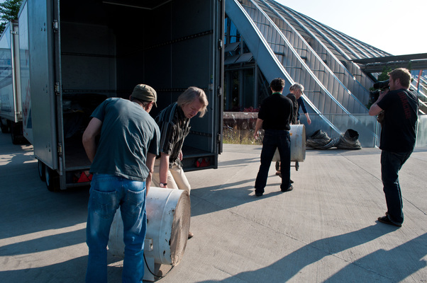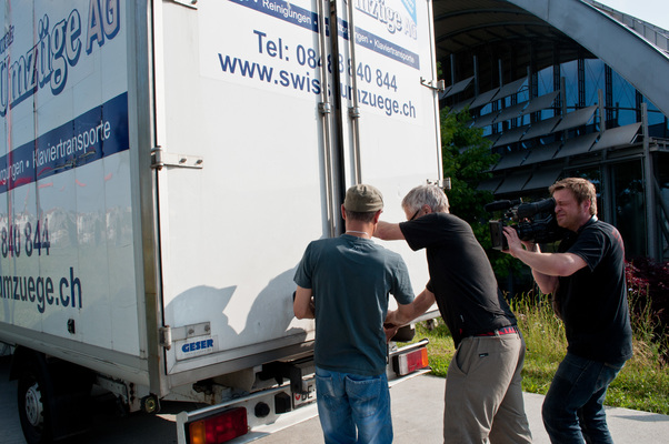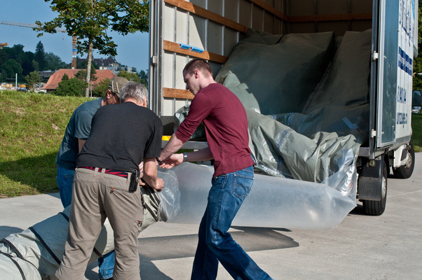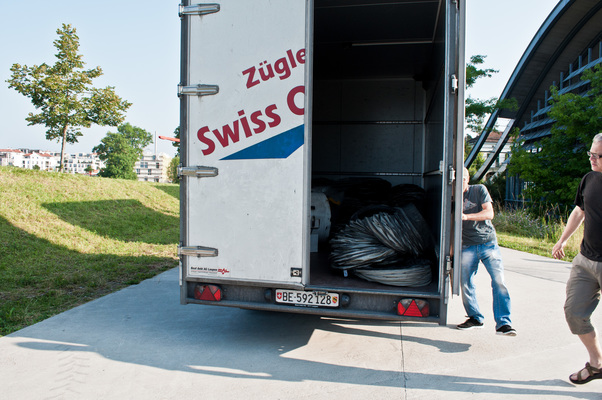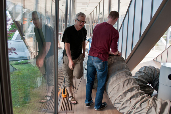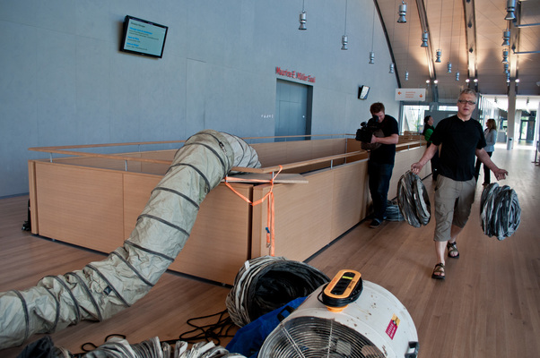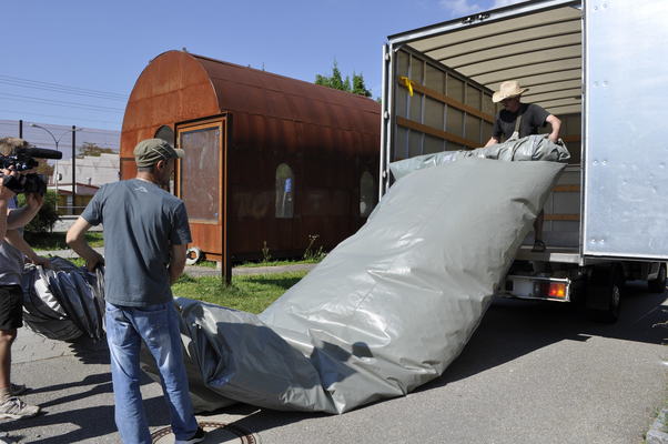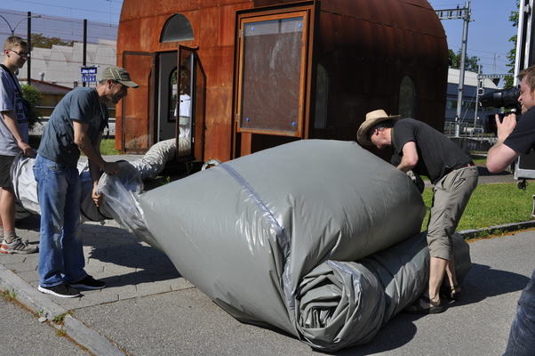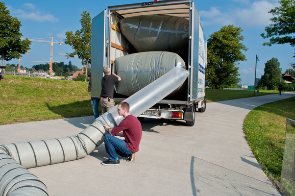 La charge aérienne est transportée devant la cabane B par le convoi de brides. En quelques gestes rapides, le tuyau est monté et le ventilateur est placé dans la Cabane B. Le ventilateur souffle alors l'air incubé avec l'art du grand maître dans l'espace vide - le "White Cube" - et anime l'ouest de Berne.
