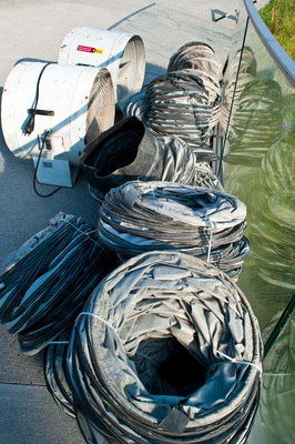 L'air s'écoule à travers le dispositif d'aspiration dans des enveloppes en plastique fermées de type ballon, fabriquées à partir de matériaux d'emballage et prémontées dans des véhicules de déménagement. Lorsqu'une enveloppe d'air est remplie, elle est scellée afin que le précieux air ne puisse pas s'échapper. L'enveloppe suivante est remplie à l'aide du dispositif d'aspiration flexible.