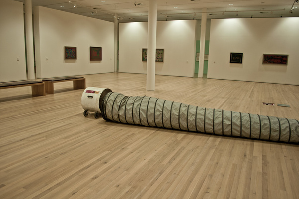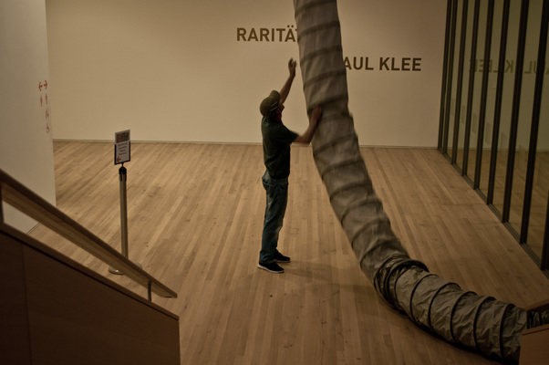 "Dans ce projet, je m'intéresse aux dimensions immatérielles et invisibles de l'art visuel. Le 6 juillet 2013, de l'air sera aspiré du Zentrum Paul Klee. Au milieu de l'exposition "Précieuses et raretés de Paul Klee", disposée de manière concentrique, est placé un distillateur axial qui aspire l'air dans un tuyau flexible. Le tuyau est