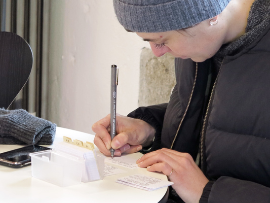 Der Transfer ist nicht auf die Objekte selbst beschränkt, denn nach jedem Spaziergang notiert Marion Ritzmann auf einer Karteikarte ihre Beobachtungen oder Gedanken zu den Gesprächen mit ihren WegbegleiterInnen und deponiert diese in einer Karteikartenbox auf den jeweiligen Displays. Somit können sich die AusstellungsbesucherInnen auch im Anschluss der eigentlichen Performance ein Bild von dieser prozesshaften Arbeit machen.
