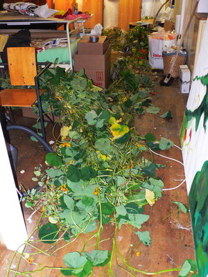 Ungefähr zehn Tage vor der Performance bin ich während zwei Tagen mit dem Auto die Kapuzinerkresse einsammeln gegangen und habe sie in meinem damaligen, ganz kleinen Atelier gelagert. Damit sie nicht vertrockneten habe ich die Stiele in Wassersäcke eingebunden. Der ganze Boden des Ateliers war überdeckt von den Pflanzen und es hat fürchterlich gestunken, weil die Ausdünstungen in dem kleinen Raum sich extrem konzentrierten.