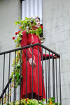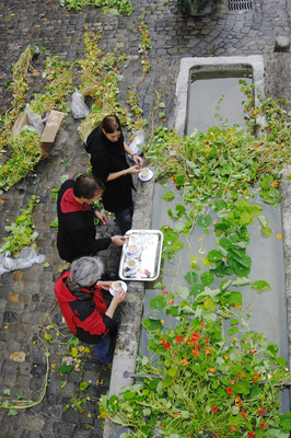 Je porte une simple robe rouge sans manches, en dessous un pull rouge et des chaussures rouges. Des capucines sont tressées dans mes cheveux. Je me tiens sur une plate-forme au-dessus de la fontaine Lischetti, à laquelle on accède par un escalier en fer. Les capucines ondulent de ma tête jusqu'à la rue, en passant par l'escalier, la fontaine et ses bacs. Je reste là, le plus immobile possible, pendant environ 90 minutes. Autour de moi, c'est l'agitation quotidienne de la ville. Les voitures passent, les passants aussi.