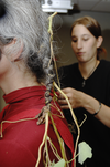 Am Tag der Performance hatte ich zwei HelferInnen. Dies waren Laura Laeser und Thomas Walther. Thomas war unser Chauffeur und Laura war meine Betreuerin während der Performance. Sie half mir auch, die Kresse über dem Brunnen auszubreiten und flocht sie mir ins Haar.