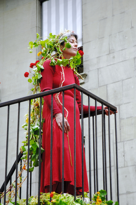 Das mythologische Bild einer Natur-Göttin im urbanen Raum hat mich über mehrere Jahre hinweg begleitet, bevor ich dieses als Performance realisiert habe. Das Bild entstand damals als spontane Assoziation, als ich einmal im Herbst in einem Garten blühende Kapuzinerkresse sah.