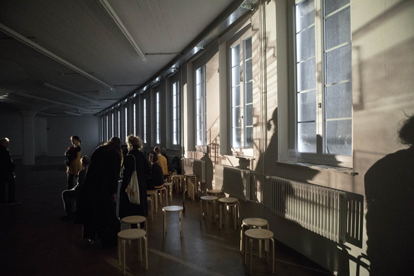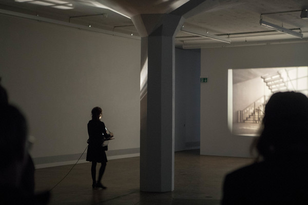 let there be light ... e divenne performance, tanto per cominciare. poi l'artista anna-sabina zürrer entra nella stanza con un proiettore di diapositive. l'immagine luminosa proiettata nella stanza mostra una tromba delle scale degli anni '50. la proiezione brilla dalla pancia dell'artista. i visitatori seguono lei e l'immagine, che è statica e allo stesso tempo in movimento. si annida intorno alle colonne come un gatto. proporzioni diverse giocano con la nostra percezione.