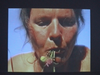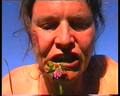 "Mordre la poussière" est une expression emblématique de la mort, très probablement dérivée du comportement des soldats blessés, rapporté depuis l'Antiquité dans les sources écrites, qui mordaient la terre sur le champ de bataille pour faire taire leur douleur. Dans l'installation, Pascale Grau aborde cette expression à un niveau performatif, (corporel) linguistique : elle s'agenouille dans le gazon, penche la tête en avant dans des mouvements éruptifs, presque comme en transe, et arrache avec sa bouche quelques touffes de trèfle rouge qu'elle mâche ensuite. Elle traduit les enregistrements de la performance vidéo en une mise en forme audiovisuelle qui présente clairement les traits d'un "phrasé musical". L'enchaînement infini de la séquence d'images projetées plus vraies que nature, qui ne dure que quelques secondes, crée un rythme presque méditatif, encore intensifié par le son - des bruits de broyage ou de mastication forts, exagérés et également structurés de manière métrique. Grau formule un équivalent visuel direct de la figure linguistique qui lui donne son titre, dont elle dissout en quelque sorte le potentiel sémantique dans l'acte performatif. Elle s'adonne au broutage avec une détermination joyeuse, mâchant pour ainsi dire les contextes de signification habituels. Chaque "prise alimentaire" semble produire de nouvelles associations, dans lesquelles se superposent langue et image, références linguistiques et culturelles. (Irene Müller 2009)