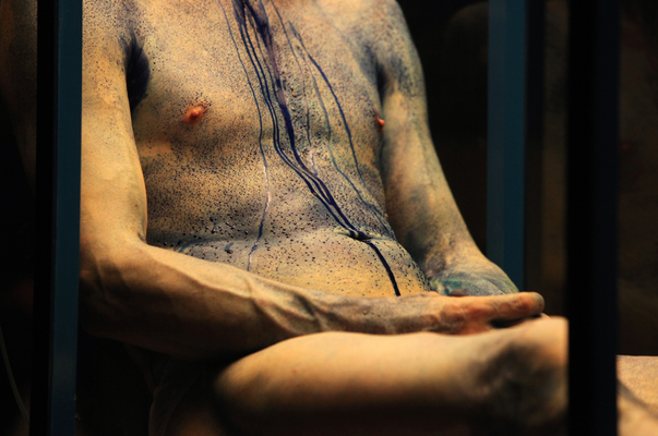 Sein Körper ist unbeweglich, die Augen geschlossen, die Augen offen. Nach und nach beginnen blaue Tränen über seine Wangen zu rollen, er weint blau. Aus seiner Nase läuft blauer Rotz, aus seinem Mund blauer Schleim, aus seinen Achseln blauer Schweiß und jetzt auf seiner Stirn, seinem Rücken, seinem Bauch, seinen Beinen, sein ganzer Körper schwitzt blau. Immer auf der Suche nach diesem universellen Menschen greift er das Wesentliche von Bleu Provisoire auf, knetet es, verwandelt es, metamorphosiert es, um die Sinne zu erschüttern und diese verletzliche menschliche Realität besser zu enthüllen. Durch seine unsichtbaren Bewegungen, den Blick und seinen sichtbar gemachten blauen Schweiß gelingt es Yann Marussich, unser Äußeres zu verinnerlichen und unser Unbewusstes bewusst zu machen.