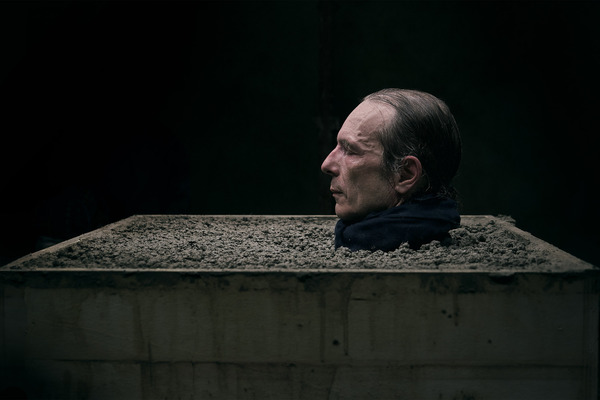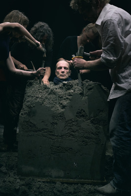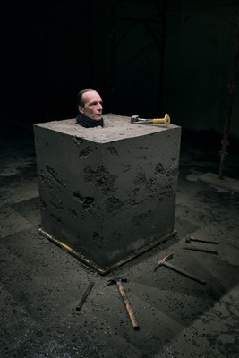 Una performance radicale: un uomo viene gettato in un cubo di cemento. Ne esce solo la testa. Il resto è vostro.